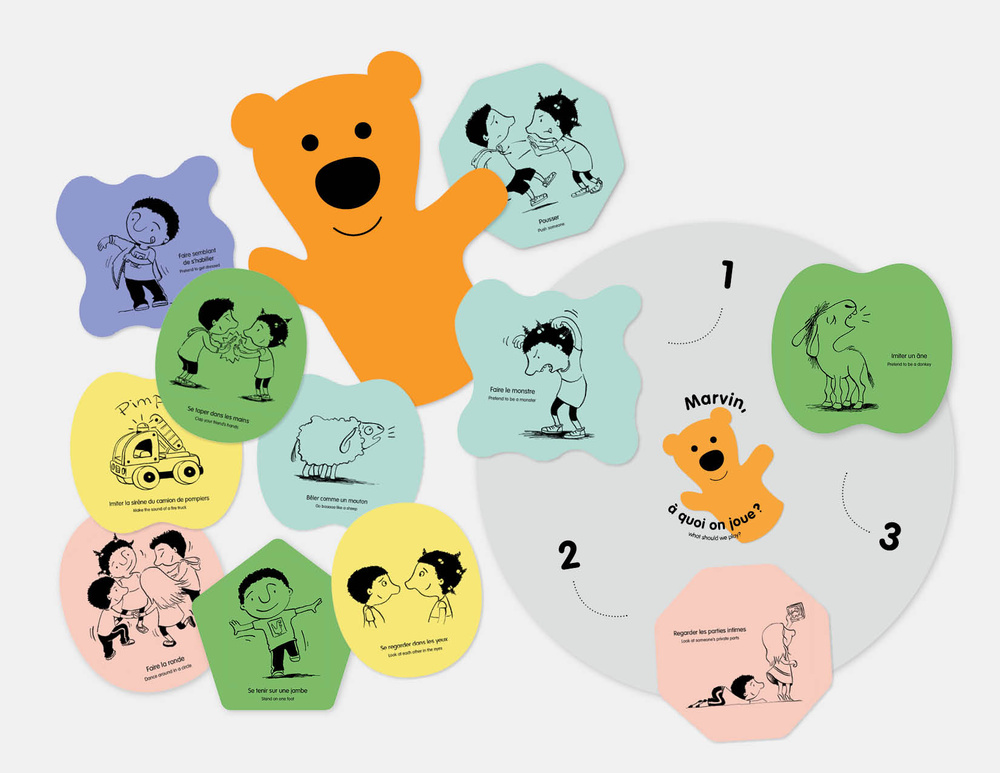 Marvin, à quoi on joue? est un outil pédagogique qui permet aux parents ainsi qu’aux intervenant·e·s gravitant autour des tout-petits d’aborder, dans un cadre amusant et sécuritaire, des notions de protection de soi face à la violence sexuelle.